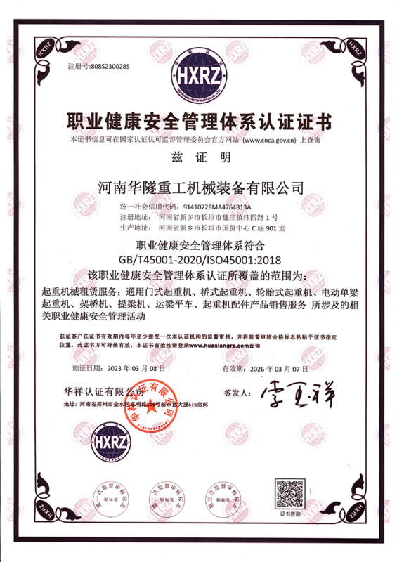 河南華隧重工機械裝備有限公司主要從事通用門式起重機、橋式起重機、電動單梁起重機,輪胎式起重機、架橋機、提梁機、遠梁平車、鋼絲繩電動萌蘆、卷揚機、起重配件制造、銷售:起重機械租賃、安裝和維修,起重設備園收,機械設備維修,鋼結構工程承包,橋梁工程及技術咨淘服務,銷售五金制品、機電設備:建設工程監(jiān)理,建設工程設計,各類工程建設活動,建筑勞務分包,建筑物折除作業,施工作業,工程管理服務,土石方工程施工,裝如發(fā)運。  公司已通過IS0國際質量、環(huán)境、健康與安全三合一標準認證,特種設備制造許可證和特種設備安裝改造維修許可證。擁有完熟的質量管理體系。嚴格的管理制度,強大的生產能力和先進的檢測手段,在保證產品質量的同時,也具備了極強的市場競爭力。  公司堅持科技創(chuàng)新為理念,產品質量為核心,注重信譽,建立了減信可靠、快捷、思速。便利周到的售后服務網絡。  我們擁有的技術專家和技術服務隊伍為客戶提供充善的售前技術支持和全天候的售后服務體系,讓您無后顧之憂,享受一站式的超值服務。  “華隧重工,伴您成功“是華隧重工永遠的宗指,真被的希望與各界朋友攜手并進。共創(chuàng)輝準!